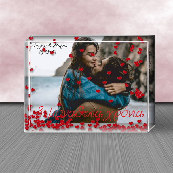 Η Κορνίζα με αιωρούμενες καρδούλες σε νερό προσωποποιημένη, φτιάχνεται κάθε φορά αποκλειστικά μόνο για τον δικό σας, φίλο ή φίλη και μένει για πάντα αναμνηστικό γιατί έχει τα ονοματα και την ημερομηνία που προσφέρατε το δώρο.