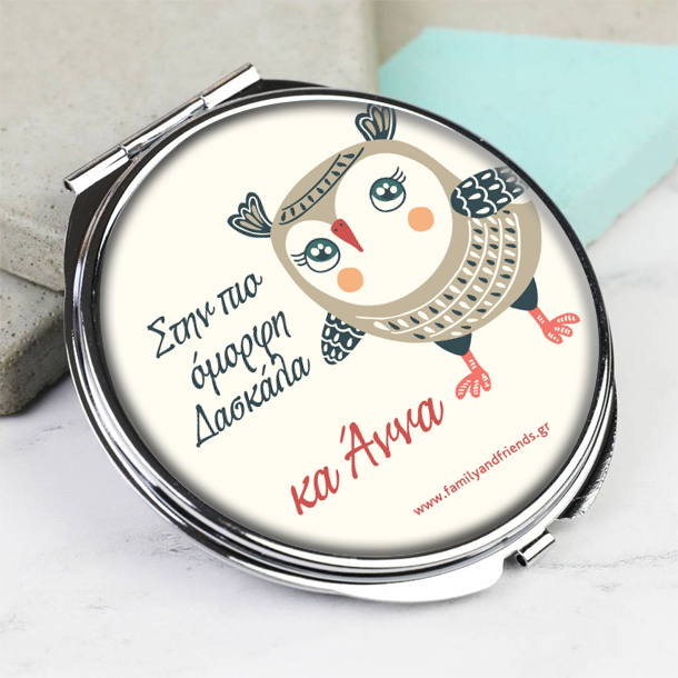 Ένα Πρωτότυπο και διαφορετικό δώρο γενεθλίων ή ονομαστικής Γιορτής για γυναίκες Προσωποποιημένο Καθρεφτάκι Τσάντας με Κουκουβάγια, Μήνυμα, Όνομα Δώρο για Γυναίκες, είναι το δώρο που θα εντυπωσιάσει την ώρα που θα το προσφέρετε στην δασκαλα, την μαμα, την θεία ή την νονά.
