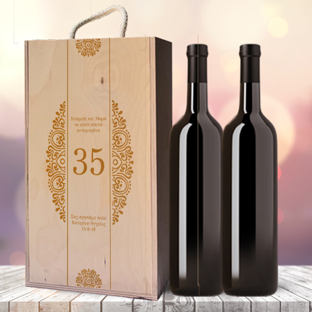 Δώρο Για Επέτειο, για Επετείους Διπλό Ξύλινο Κουτί Δώρο για Επέτειο με Χρόνια Προσωποποιημένo με ευχές για Επετείους, Ερωτευμένους, και Ονόματα, για να εκφράσετε την αγάπη σας με ένα ξεχωριστό τρόπο και με ένα μοναδικό και προσωπικό δώρο. Δυνατότητα παραγγελίας με ή χωρίς τα μπουκάλια του κρασιού.