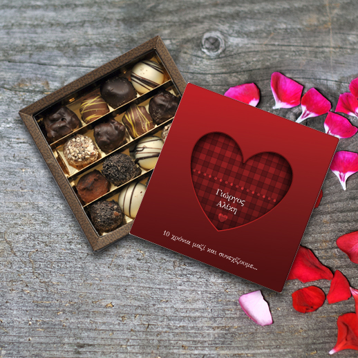 Δώρο για Ερωτευμένους Κουτί Σοκολατάκια Προσωποποιημένo για επέτειο με Ονόματα και Ευχές, για την γιορτή του Αγίου Βαλεντίνου για να εκφράσετε την αγάπη σας με ένα ξεχωριστό τρόπο και με ένα μοναδικό και προσωπικό δώρο.