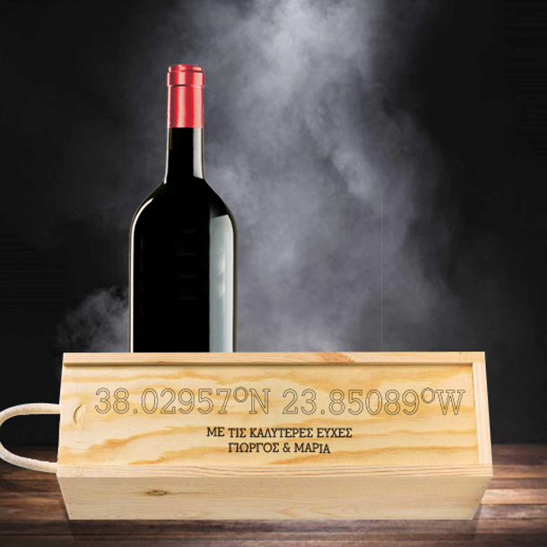 Επιλέξτε ένα πρωτότυπο και διαφορετικό τρόπο για να αποτυπώσετε με ''μυστικό'' τρόπο ένα σημείο που για εσάς ή τους φίλους σας πάνω σε ένα δώρο, Με Συντεταγμένες, Ξύλινο Κουτί για Κρασί, με Ευχές.