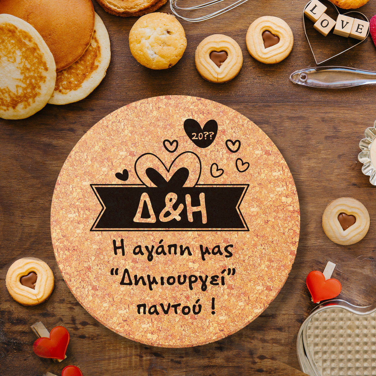 Το Προσωποποιημένο δώρο Με το μήνυμα που θέλετε Βάση από Φελλό για ζεστά σκεύη, σετ 3 τμχ με όνομα, ημερομηνία, θα δημιουργεί κάθε μερα μοναδικές αναμνήσεις όπου θα τους χρησιμοποιεί η γυναίκα σας ή ο άνδρας σας στην κουζίνα.