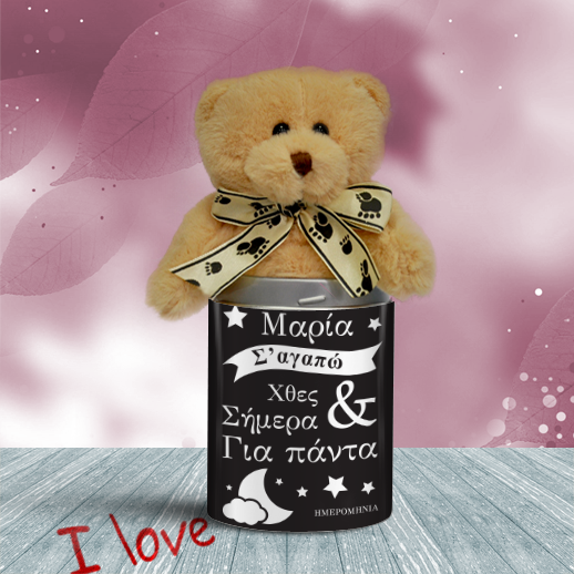 Ένα μοναδικό δώρο, Πρωτότυπο, Προσωποποιημένο Αρκουδάκι, Σε Αγαπώ σε Μεταλλικό κουτί I Love με ονόματα και ημερομηνία, είναι το Δώρο για Ερωτευμένους που ξεχωρίζει, για την γιορτή του Αγίου Βαλεντίνου, την κάθε επέτειο ερωτευμένου ζευγαριού. Εκφράστε την αγάπη σας με ένα ξεχωριστό τρόπο και με ένα μοναδικό και προσωπικό δώρο που δημιουργεί μοναδικές στιγμές.