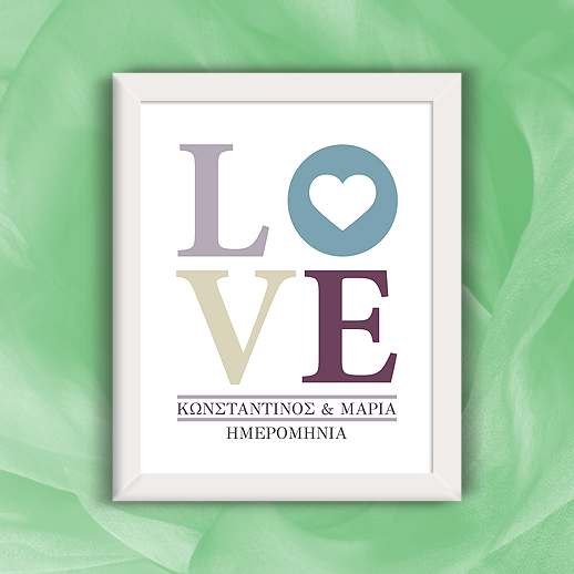 Επίσης το προσωποποιημένο κάδρο Love με ονόματα και ημερομηνία, με εκτύπωση το όνομα του φίλου ή της φίλης σας, μπορεί να δοθεί σαν δώρο με αφορμή τα γενέθλια ή την γιορτή του συντρόφου κάθε ερωτευμένου ζευγαριού. Δώρο που μπορεί να δοθεί από την σύζυγο στο σύζυγο για να εκφράσει τα συναισθήματα που είναι προσωπικό, ξεχωριστό και δημιουργεί μοναδικές αναμνήσεις για πάντα.