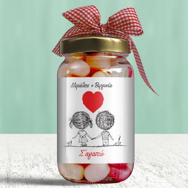 Πρωτότυπο Δώρο για Ερωτευμένους Προσωποποιημένο Βαζάκι με Καραμέλες Σε Αγαπώ με Σκίτσα, Καρδιά, με όνομα, για την γιορτή του Αγίου Βαλεντίνου ή την επέτειο ερωτευμένων ζευγαριών, για να εκφράσετε την αγάπη σας με ένα ξεχωριστό τρόπο και με ένα μοναδικό και προσωπικό δώρο.