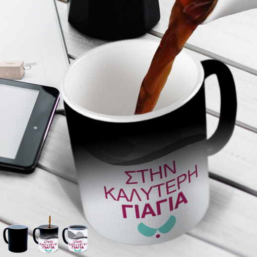 Η Μαγική κούπα είναι Μαύρη αλλά μόλις ρίξετε μέσα τον ζεστό καφέ ή τσάι αλλάζει χρώμα γίνεται ασπρη και εμφανίζεται το εικαστικό που έχετε επιλέξει.