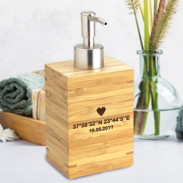 Προσωποποιημένο Ντισπένσερ με Συντεταγμένες γνωριμίας σε Αντλία κρεμοσάπουνου από bamboo, με χάραξη laser, Δώρο ονομαστικής Γιορτής για φίλους και φίλες.
