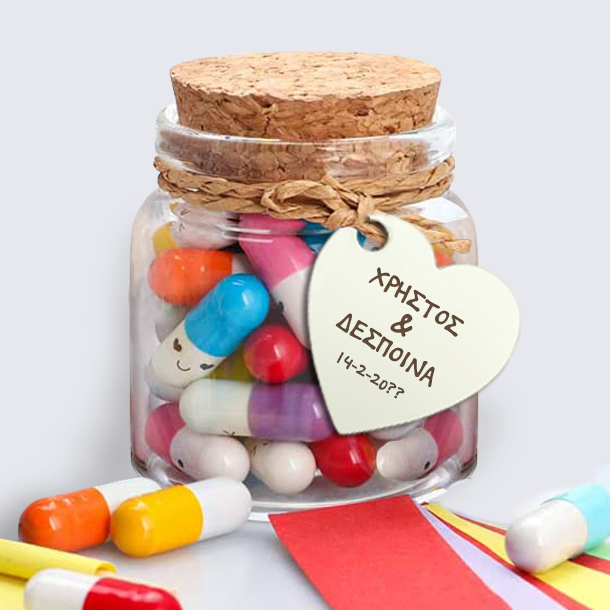 Ένα μήνυμα για κάθε μέρα είναι το πιο δυνατό ''φάρμακο" για το αγόρι σας ή το κορίτσι σας. Βαζάκι κάψουλες για μηνύματα με Ονόματα, Ημερομηνία για να γράψετε τα μηνύματα που θέλετε στον αγαπημένο σας ή την αγαπημένη σας κάθε μέρα ή όλα μαζί και με την "συνταγή" σας.