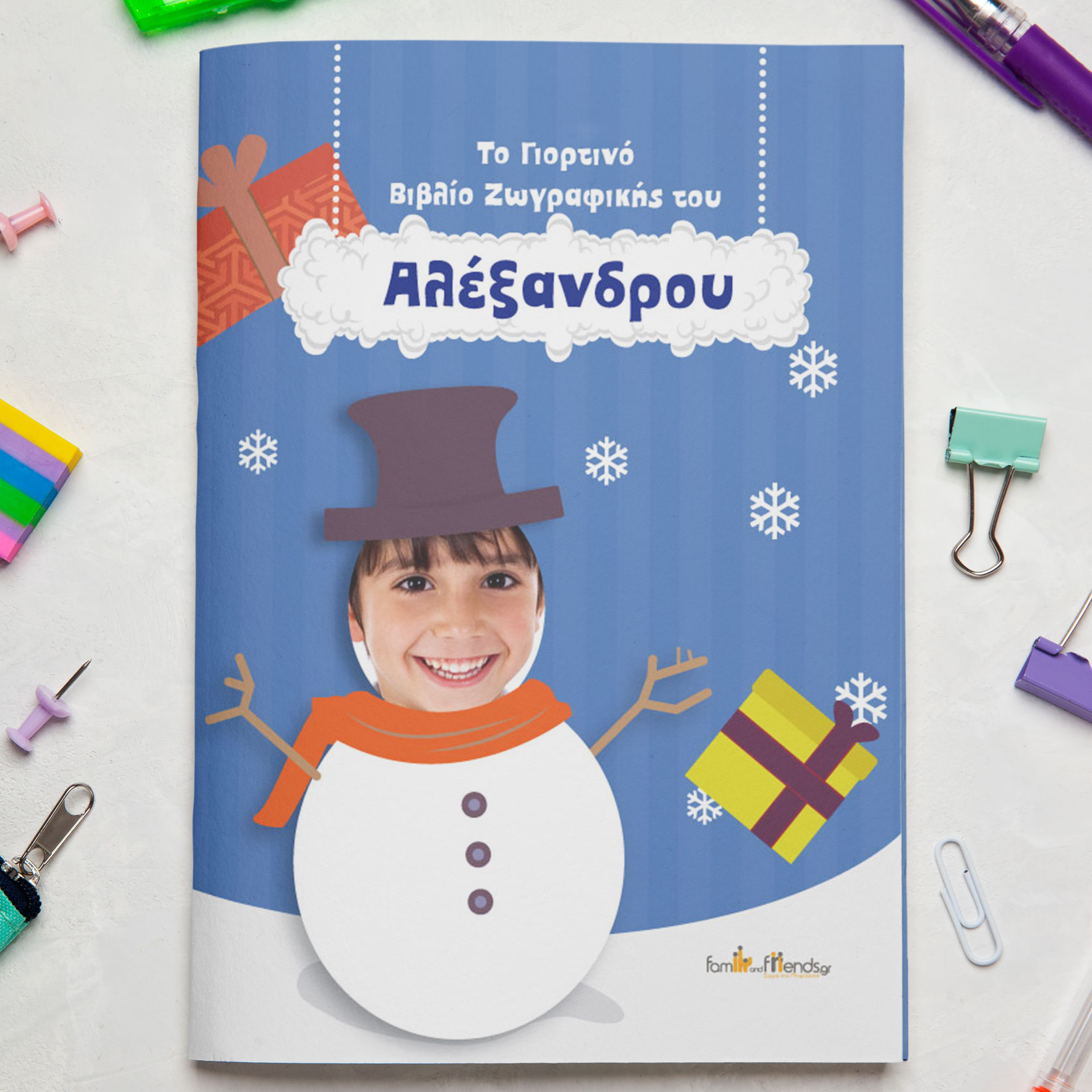 Χριστουγεννιάτικο Βιβλίο Ζωγραφικής για Αγόρια για ένα πρωτότυπο δώρο για παιδιά από την μαμά και τον μπαμπά για παιδιά στο νηπιαγωγείο και στο δημοτικό. Φέτος τα Χριστούγεννα ξεχωρίστε δίνοντας δώρο στο βαφτιστήρι σας ένα Χριστουγεννιάτικο βιβλίο ζωγραφικής με ήρωα εκείνο. Το βιβλίο δραστηριοτήτων θα έχει την φωτογραφία του παιδιού σας ή απλό σκίτσο και το όνομα του παιδιού σας στις εσωτερικές σελίδες και στο εξώφυλλο!