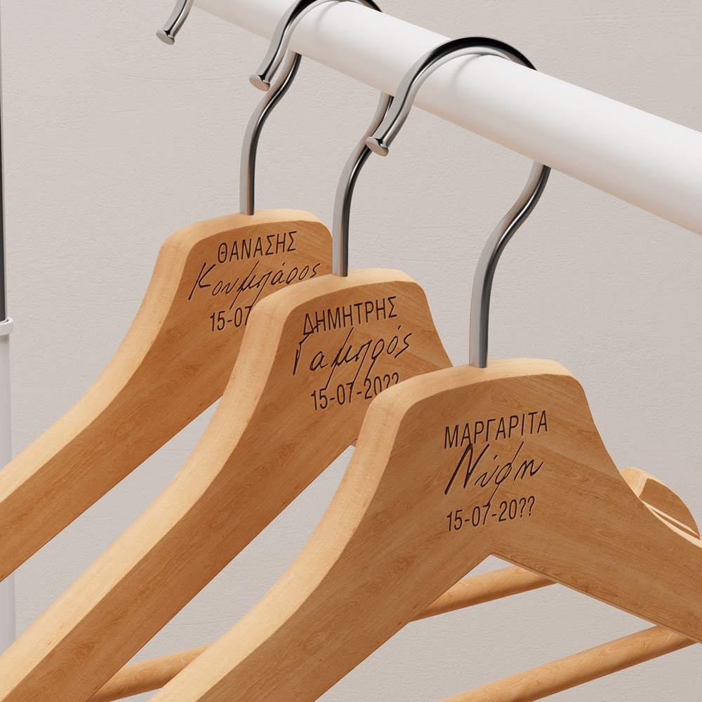 Γαμήλιο δώρο σε συγγενείς και φίλους Κρεμάστρες για Νύφη, Γαμπρό, Κουμπάρους με Ονόματα με χάραξη λέιζερ, laser, που θα δημιουργεί μοναδικές αναμνήσεις κάθε φορά που θα τις βλέπουν στην ντουλάπα τους και θα τις χρησιμοποιούν.