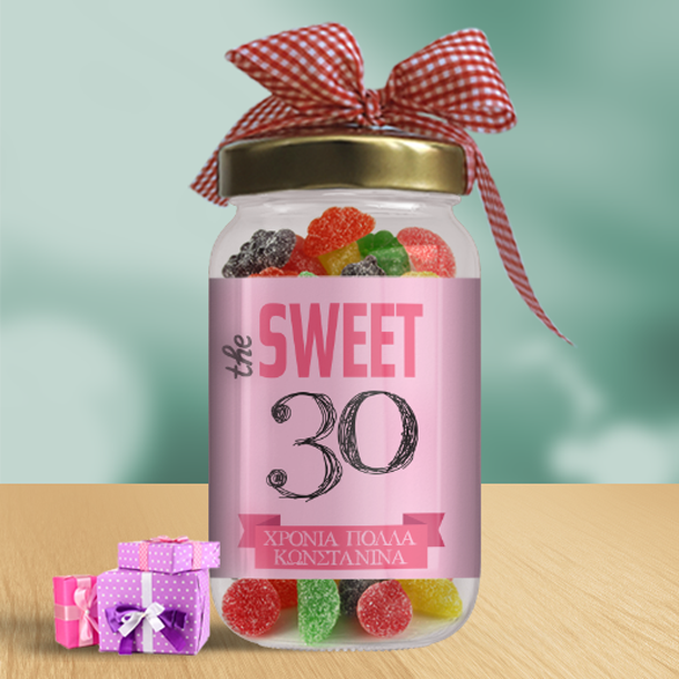 Το Προσωποποιημένο Δώρο Γενεθλίων με ηλικία, Βαζάκι με Καραμέλες Sweet Age, και όνομα είναι ένα ξεχωριστό και πρωτότυπο δώρο για τα γενέθλια της φίλης σας! Το Προσωποποιημένο Δώρο Γενεθλίων με ηλικία, Βαζάκι με Καραμέλες Sweet Age με εκτύπωση το όνομα, μπορεί να δοθεί σαν δώρο γενεθλίων στη φίλη σας για τα 20 χρόνια, τα 30 χρόνια, τα 40 χρόνια που συμπληρώνει. επίσης είνια άνα ξεχωριστό δώρο για συγγενείς όπως η ξαδέρφη σας γιατί είναι προσωπικό, ξεχωριστό και δημιουργεί μοναδικές αναμνήσεις για πάντα. Προσωποποιημένο Βαζάκι με Καραμέλες  Sweet Thirty, μπορεί να δοθεί σαν δώρο στην Γιαγιά με αφορμή τα γενέθλιά της. Μπορείτε επίσης να τη συνδυάσετε με μια προσωποποιημένη κούπα για τον καφέ ή το τσάι ΠΕΡΙΓΡΑΦΗ ΠΡΟΙΟΝΤΟΣ Γυάλινο Βαζάκι με 4χρωμη προσωποποιημένη ετικέτα. ΜΕΓΑΛΟ ΒΑΖΑΚΙ 14,5cm ύψος, 7,5cm Διάμετρος, περίπου 150γρ. καραμέλες ζελεδάκια ΜΙΚΡΟ ΒΑΖΑΚΙ 10,5cm ύψος, 7,5cm Διάμετρος, περίπου 90γρ. καραμέλες ζελεδάκια