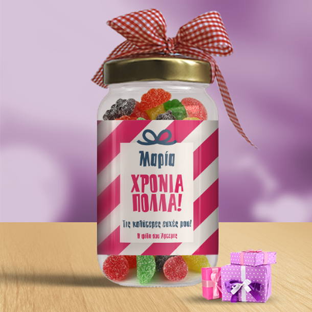 Το Προσωποποιημένο Δώρο για Ονομαστική Εορτή, Δώρο για Χρόνια Πολλά, Βαζάκι με καραμέλες με Όνομα, μπορεί να είναι το δώρο γιορτής στη φίλη σας, στην θεία, στην Μαμά, τον Μπαμπά και κάθε άλλο φιλικό ή συγγενικό πρόσωπο και είναι ένα ξεχωριστό δώρο διαφορετικό από κάθε άλλο που έχετε κάνει μέχρι σήμερα, γιατί είναι προσωπικό και δημιουργεί μοναδικές αναμνήσεις για πάντα.