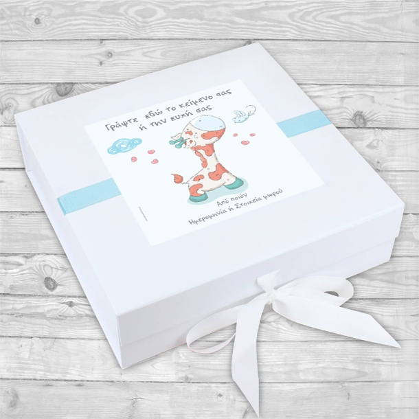 Επιλέξτε ένα Πολυτελές Κουτί με κορδέλα, για Νεογέννητα, με το δικό σας μήνυμα, Προσωποποιημένο Δώρο για Νεογέννητο αγοράκι ή κοριτσάκι, για να ευχηθείτε στο νέο μωράκι που γεννήθηκε και στους γονείς του.