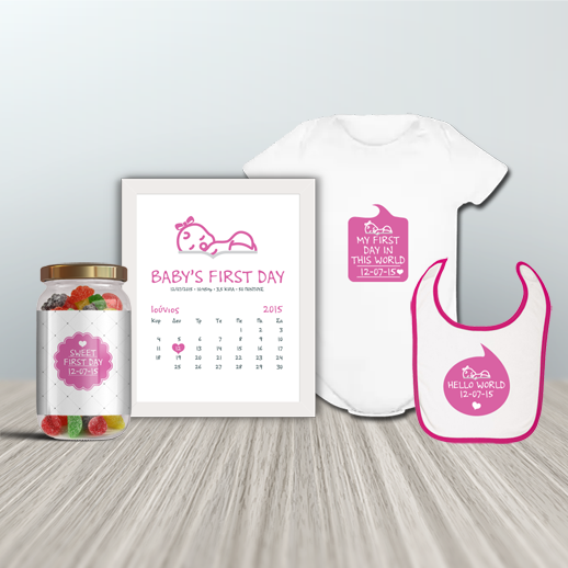 First Day, Δώρο Σετ για Νεογέννητο Κοριτσάκι με Ημερομηνία Γέννησης, Κοριτσάκια, που είναι ειδικά φτιαγμένο για τη γέννηση του παιδιού.