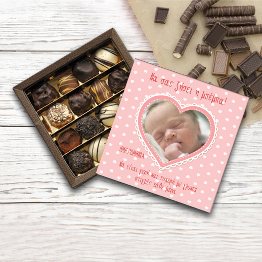 Γεννήθηκε νέο μωράκι στην οικογένεια και έχετε να κάνετε δώρο για το νεογέννητο μωράκι σε φίλους ή συγγενείς; Κάντε ένα Μοναδικό Δώρο Κουτί Σοκολατάκια για Νεογέννητο Προσωποποιημένo με Φωτογραφία, για Νεογέννητο κοριτσάκι, για να ευχηθείτε στο νέο μωράκι που γεννήθηκε και στους γονείς του.