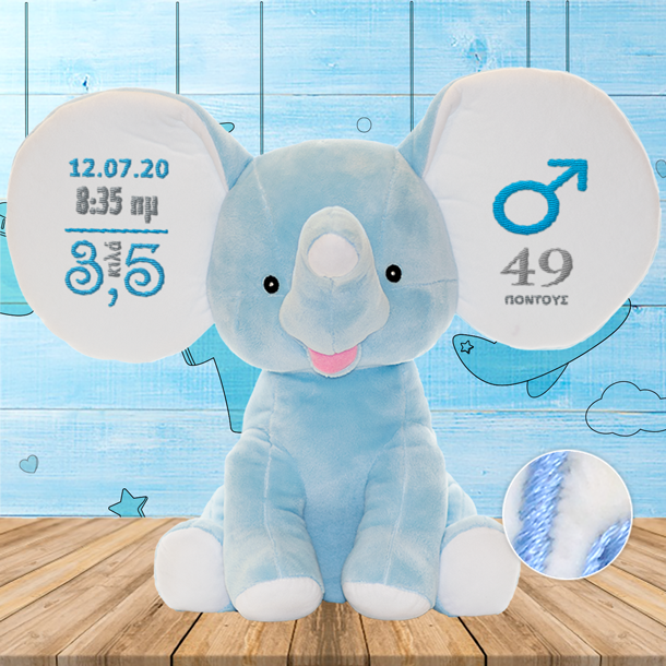 Σιελ Ελεφαντάκι με Κεντημένα Στοιχεία Γέννησης Μωρού.