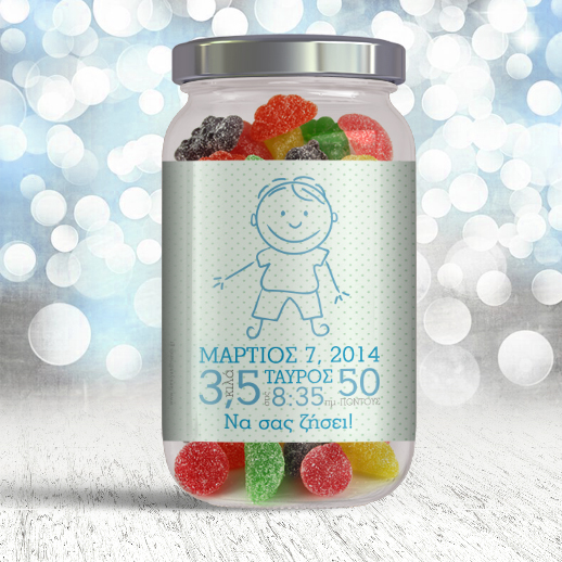 Ενα ξεχωριστο και μοναδικό δώρο για κάθε νεογέννητο μωρό στο οικογενειακό ή φιλικό σας περιβάλλον. Βαζάκι με Καραμέλες με σκίτσο, Δώρο για Νεογέννητα με στοιχεία γέννησης, για να κάνετε ένα ξεχωριστό δώρο για το νεογέννητο αγοράκι ή κοριτσάκι που θα επισκεφθείτε στο μαιευτήριο. Ένα μοναδικό δώρο για κάθε νεογενητο αγοράκι στο οικογενειακό σας περιβάλλον, που μπορείτε να Γράψτε την Ευχή σας στο Δώρο Βαζάκι με Καραμέλες με σκίτσο, Δώρο για Νεογέννητα με στοιχεία γέννησης, για Νεογέννητο με ευχές και το υψος, τα κιλά και την Ηεμερομηνία, που ήρθε στον κόσμο το νεο μελος της οικογένειας για να ευχηθείτε και να Καλωσόρισετε στον Μπέμπη, που μόλις γεννήθηκε. Γίνατε γιαγιά; το δώρο της γιαγιας για το νεογέννητο εγγονάκι που θα ξεχωρίσει από όλα τα άλλα και θα στολίζει το παιδικό δωμάτιο αν όχι για πάντα, σίγουρα για πολλά χρόνια είναι το Βαζάκι με Καραμέλες με σκίτσο, Δώρο για Νεογέννητα με στοιχεία γέννησης Όνομα, Ηεμερομηνία και θα δημιουργρί πάντα μοναδικές αναμνήσεις σε εσάς στο μωράκι και όλη την οιογένεια. Το μοναδικό δωρο της θείας ή του θείου στο νεογέννητο ανηψάκι που μένει Αναμνηστικό για πάντα είναι Βαζάκι με Καραμέλες με σκίτσο, Δώρο για Νεογέννητα με στοιχεία γέννησης, είναι το προσωποποιημένο δώρο που φτιάχνεται χειροποίητα αποκλειστικά για κάθε μωράκι, είναι το δώρο έξω από τα συνηθισμένα που μπορεί να προσφέρει ο Παππούς και η Γιαγιά στο νεογέννητο εγγονάκι τους. Βαζάκι με Καραμέλες με σκίτσο, Δώρο για Νεογέννητα με στοιχεία γέννησης, με την Ηεμερομηνία γέννησης τα κιλά και το υψος, και θα είναι το διαφορετικό δώρο του Νονός, νονου ή της Νονάς στο νεογέννητο βαπτιστηρι τους. Δώρο Βαζάκι με Καραμέλες, για Νεογέννητο Αγοράκι με Φωτογραφία με το Όνομα του μωρου που θα στολίζει το παιδικό δωμάτιο για πολύ καιρό και θα κρατηθεί σαν αναμνηστικό για πάντα από κάθε οικογένεια και θα θυμίζει το ‘δώρο της θείας’ Βαζάκι με Καραμέλες με σκίτσο, Δώρο για Νεογέννητα με στοιχεία γέννησης με Όνομα, Ηεμερομηνία, και μπορείτε να το προσφέρετε στο μαιευτήριο ή στην επισκεψη σας στο σπίτι, θα ξεχωρίσει από όλα τα άλλα δώρα που θα πάρει το αγοράκι. ΠΕΡΙΓΡΑΦΗ ΠΡΟΙΟΝΤΟΣ Γυάλινο Βαζάκι με 4χρωμη προσωποποιημένη ετικέτα. ΜΕΓΑΛΟ ΒΑΖΑΚΙ 14,5cm ύψος, 7,5cm Διάμετρος, περίπου 150γρ. καραμέλες ζελεδάκια ΜΙΚΡΟ ΒΑΖΑΚΙ 10,5cm ύψος, 7,5cm Διάμετρος, περίπου 90γρ. καραμέλες ζελεδάκια