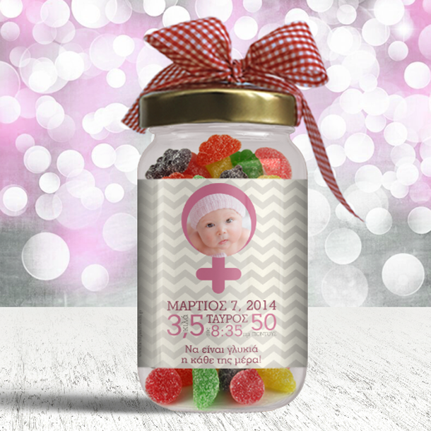 Βαζάκι με Καραμέλες, Προσωποποιημένο με στοιχεία γέννησης της Μπέμπας, Δώρο για Νεογέννητο με φωτογραφία, με την Ηεμερομηνία γέννησης τα κιλά και το υψος, και θα είναι το διαφορετικό δώρο του Νονός, νονου ή της Νονάς στο νεογέννητο βαπτιστηρι τους.