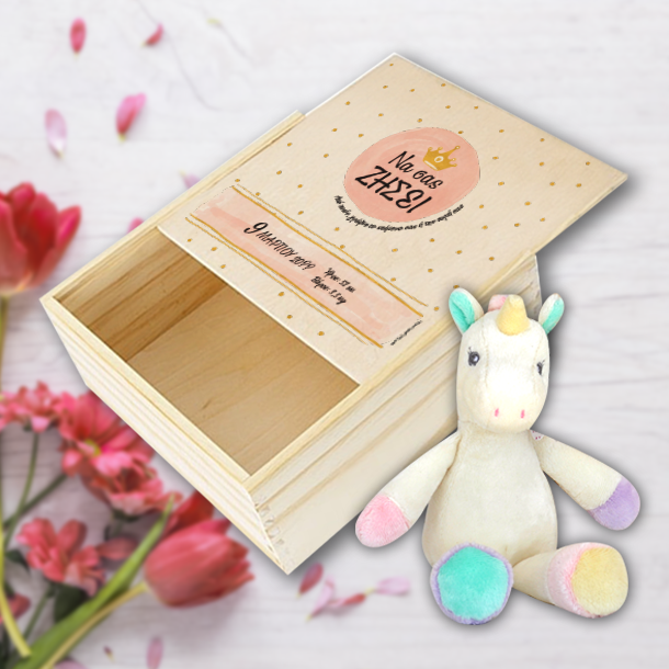 Το Ξύλινο Κουτί με Λούτρινο Μονόκερο, με Ευχές, Στοιχεία Μωρού για Νεογέννητο κοριτσάκι, μπορείτε να το προσφέρετε στο μαιευτήριο ή στην επίσκεψη σας στο σπίτι, θα ξεχωρίσει από όλα τα άλλα δώρα που θα πάρει το αγοράκι.