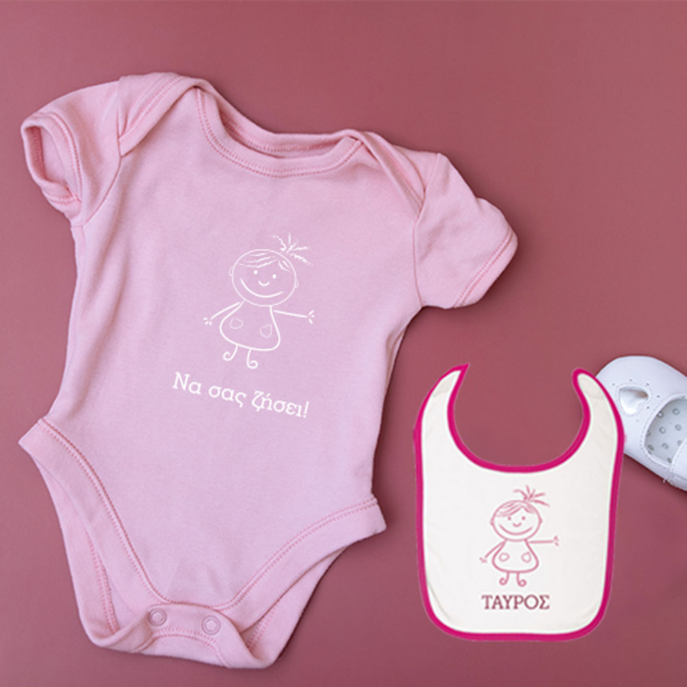Ένα μοναδικό δώρο για κάθε νεογέννητο κοριτσάκι στο οικογενειακό σας περιβάλλον, Να σας ζήσει, Δώρο για Νεογέννητo Κοριτσάκι, Φορμάκι & Σαλιάρα, Ημερομηνία, με προσωποποιημένο tshirt για να ευχηθείτε και να Καλωσορίσετε την Μπέμπα, που μόλις γεννήθηκε και να στους γονείς του.