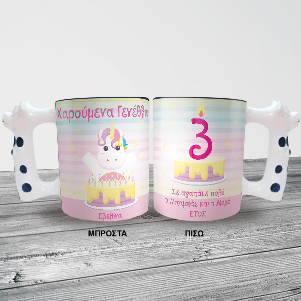 Προσωποποιημένη Παιδική Κούπα με χερούλι αγελάδα, με όνομα, Ηλικία γενεθλίων, την ευχή που θέλετε ημερομηνία και ονόματα είναι το δώρο που θα ξεχωρίσει απο όλα τα αλλα γιατί είναι διαφορετικό από όλα όσα έχετε κάνει μέχρι σήμερα.