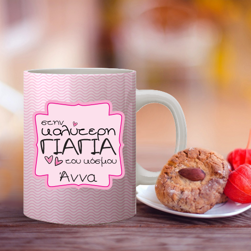 Το Προσωποποιημένο Δώρο για τη Γιαγιά, Κούπα με όνομα είναι ένα ξεχωριστό δώρο για την αγαπημένη σας γιαγιά που θα την εντυπωσιάσει με όποια αφορμή και αν το προσφέρετε! Για το Προσωποποιημένο Δώρο κούπα για τη Γιαγιά μπορείτε να επιλέξετε ανάμεσα στην κλασική λευκή κούπα και στην μαγική μαύρη κούπα που αλλάζει χρώμα μόλις βάλατε κάθε ζεστό ρόφημα εμφανίζοντας το μήνυμα που γράφετε για την γιαγια. Το Προσωποποιημένο Δώρο για τη Γιαγιά, Κούπα με όνομα και μήνυμα στην Καλύτερη Γιαγιά του Κόσμου και το όνομά σας είναι ένα οικονομικό δώρο που μπορείτε να κάνετε στη γιαγιά για να της δείξετε πόσο πολύ την αγαπάτε! Ένα μοναδικό, προσωποποιημένο Δώρο για τη Γιαγιά, Κούπα με όνομα, που έχει φτιαχτεί αποκλειστικά και μόνο για τη δικιά σας πολυαγαπημένη γιαγιά! Ενα δώρο που θα μείνει για πάντα στο ντουλάπι της γιαγιάς και θα δημιουργεί κάθε φορά μοναδικές αναμνήσεις κάθε φορά που θα πίνει τον αγαπημένο της καφέ ή τσάι. Αν έχετε επιλέξει την μαγική κούπα το μήνυμα σας θα εμφανίζεται μόλις η γιαγιά βάλει το ζεστό της τσάι στην κούπα!