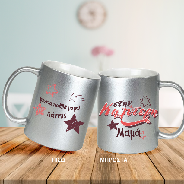 Προσωποποιημένη Γκρι Κούπα με Γκλίτερ με το Μήνυμα σας και Όνομα και το δικό σας κείμενο, την ευχή που θέλετε ημερομηνία και ονόματα είναι το δώρο που θα ξεχωρίσει απο όλα τα αλλα στην φετινή γιορτή της μητέρας γιατί είναι διαφορετικό από όλα όσα έχετε κάνει μέχρι σήμερα στην μαμα.
