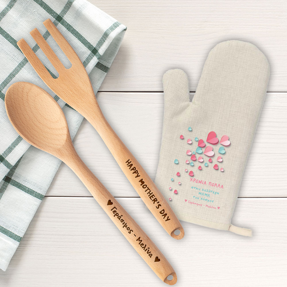 Γιορτάζει η Μαμά και θέλετε ένα διαφορετικό δώρο που θα ξεχωρίσει από όλα τα προηγούμενα? Ανακαλύψτε το διαφορετικό Προσωποποιημένο Δώρο για την κουζίνα της, Σετ Πιρούνα, Κουτάλα με χάραξη laser & Γάντι για ζεστά σκεύη, με Ονόματα, Μήνυμα που θα εντυπωσιάσει.