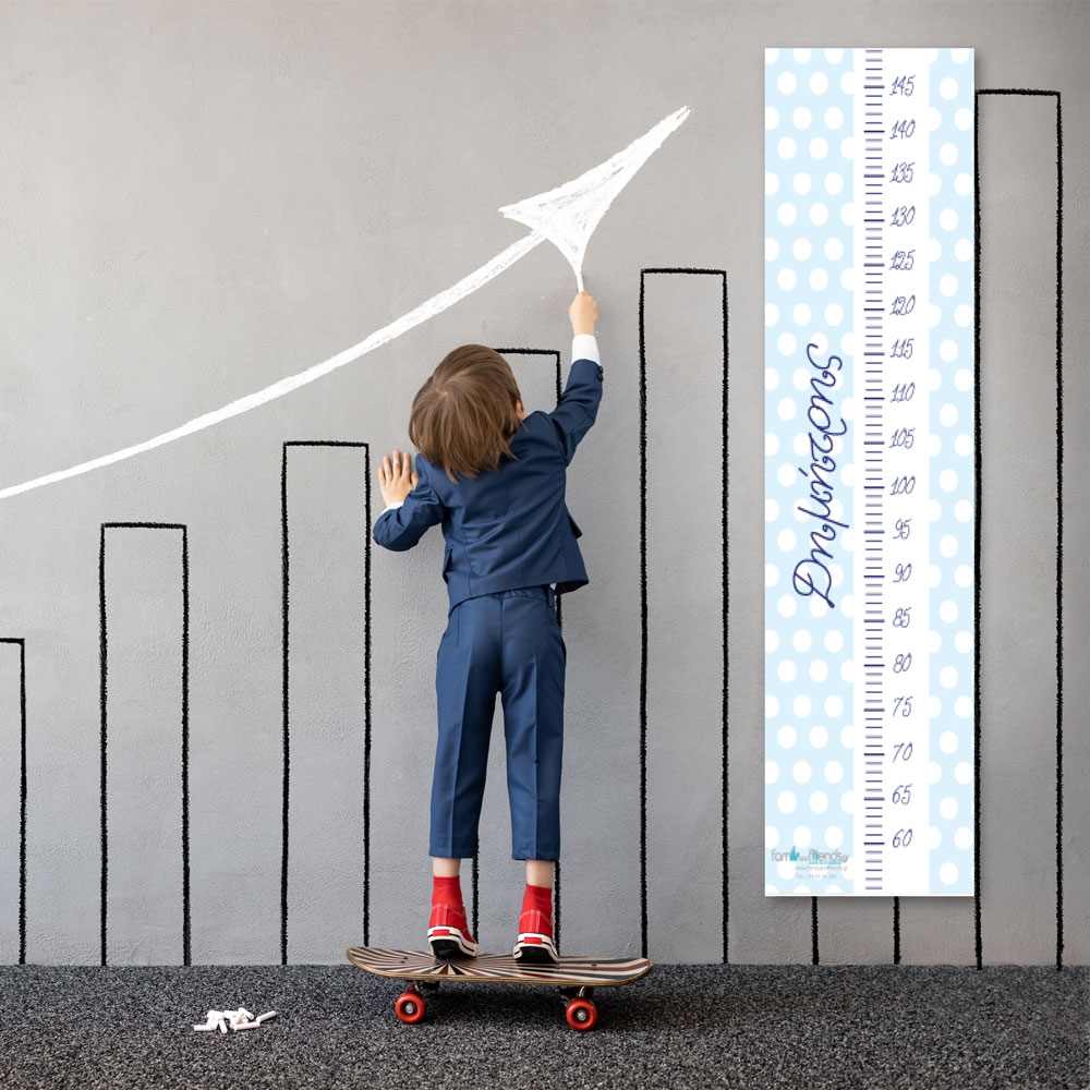 Μετρητής ύψους για αγόρι, μπλε με λευκά πουά, με δυνατότητα να συμπληρώσετε το όνομα του παιδιού σας