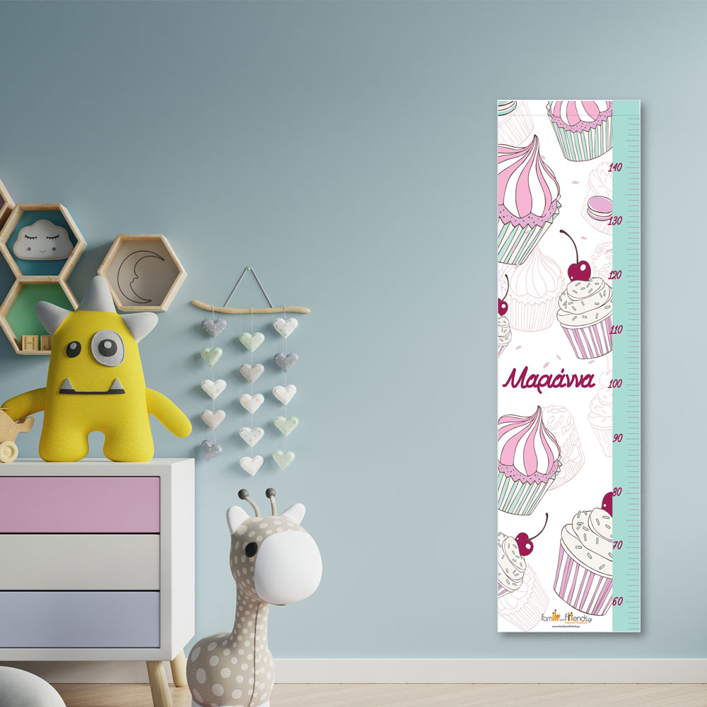 Μετρητής Ύψους με Cupcakes για να διακοσμήσετε το παιδικό δωμάτιο των κοριτσιών από 4 ετών έως 6 ετών. Κάντε δώρο στα εγγόνια και στα ανίψια σας ένα μοναδικό δώρο με το όνομά τους.