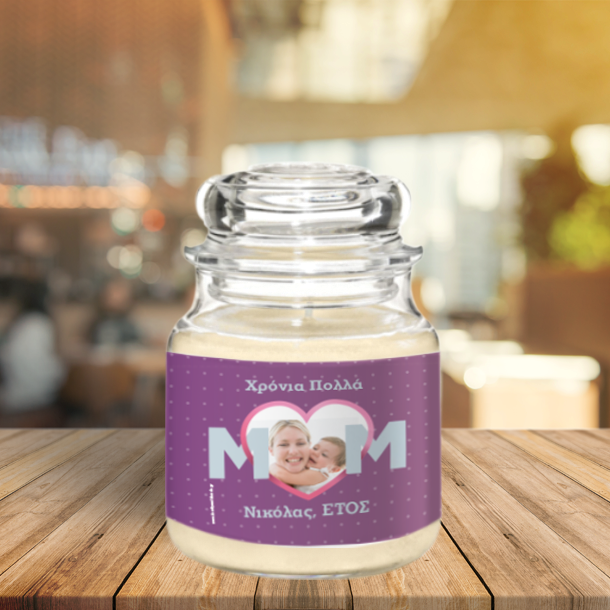 Προσωποποιημένο Κερί με Φωτογραφία σε Γυάλινο Βάζο με Καπάκι για την Μαμά με όνομα και ημερομηνία γίνεται ένα μοναδικό δώρο για την Μαμά για την Γιορτή της μητέρας.