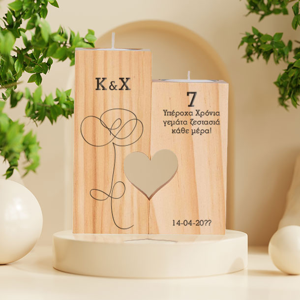 Ανακαλύψτε ένα μοναδικό προσωποποιημένο δώρο Ξύλινο Κηροπήγιο δύο θέσεων με χάραξη Ονόματα, Ημερομηνία, για την επόμενη επέτειο που γιορτάζετε με τον αγαπημένο ή την αγαπημένη σας.