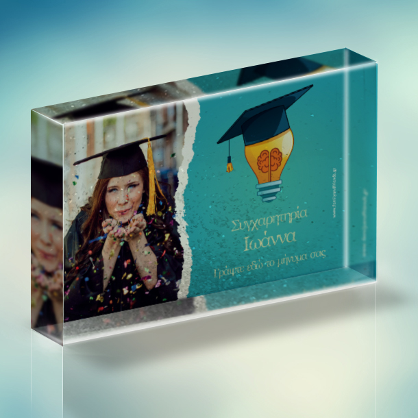 Αποφοιτά κάποιος φίλος, φίλη ή συγγενής από οποιοδήποτε στάδιο της εκπαίδευσης του? Δώστε του ένα ξεχωριστό Δώρο Αποφοίτησης, Συγχαρητήρια σε Κορνίζα με Καπέλο αποφοίτησης, αιωρούμενο γκλίτερ και Ευχές, με Φωτογραφία, Ευχές και ημερομηνία, ένα Μοναδικό Προσωποποιημένο Δώρο για την αποφοίτηση από κάθε σχολείο, πανεπιστημιο ή ορκομωσία. Δώρο Αποφοίτησης, Συγχαρητήρια σε Κορνίζα με Καπέλο αποφοίτησης, αιωρούμενο γκλίτερ και Ευχές, στην πιο ξεχωριστή μέρα για κάθε μαθητη του δημοτικού ή του γυμνασίου ή του λυκείου, που ολοκληρώνει ένα στάδιο των σπουδών του, που θα εντυπωσιάσει και θα δείξετε ότι την θυμηθήκατε και πόσο πολύ την αγαπάτε! Στο familyandfriends.gr θα βρείτε μοναδικά προσωποποιημένα δώρα γενεθλίων και δώρα γιορτών προσωποποιημένα για αγόρια και κορίτσια, άνδρες και γυναίκες Κάντε και εσείς ένα μοναδικό προσωποποιημένο Δώρο Αποφοίτησης, Συγχαρητήρια σε Κορνίζα με Καπέλο αποφοίτησης, αιωρούμενο γκλίτερ, με Φωτογραφία, Ευχές στον αδελφό σας, την αδελφή σας, τον φίλο ή την φίλη σας που αποφοιτα από το πανεπιστημιο και παίρνει το πτυχιο του. Συγχαρητήρια σε Κορνίζα με αιωρούμενες καρδούλες, με Φωτογραφία, είναι ένα μοναδικό δώρο απο την θεια και τον θειο για να ευχηθείτε στον ανηψιο σας ή την ανηψια που τελειώνει το δημοτικό, το γυμνασιο ή το πανεπιστημιο, απλά αλλάζοντας τα κείμενα που σας προτείνουμε με όποιες ευχές θέλετε να γράψετε εσείς. Στα Προσωποποιημένα δώρα με ή χωρίς Φωτογραφία, για το φίλο ή τη φίλη, τον άνδρα ή τη γυναίκα μπορείτε να αλλάξετε τα κείμενα όπως εσείς θέλετε ανεξάρτητα από την δική μας πρόταση. Το Δώρο Αποφοίτησης, Συγχαρητήρια σε Κορνίζα με Καπέλο αποφοίτησης, αιωρούμενο γκλίτερ και Ευχές, φτιάχνεται κάθε φορά μετά από την παραγγελία σας αποκλειστικά μόνο για το δικο σας, αγορι ή κορίτσι, που αποφοιτά απο το πανεπιστημιο και παιρνει το πτυχίο του. Δώρο Αποφοίτησης, Κορνίζα με αιωρούμενο γκλίτερ, με Ευχές, δωρο αποφοιτησης απο την μαμα και τον μπαμπα στο γιο ή την κορη τους που αποφοιτά και θα μεινει για πάντα αναμνηστικό γιατί έχει τις ευχές και την ημερομηνία που προσφέρατε το δώρο. Πρωτότυπα προσωποποιημένα δωρα για Αποφοίτηση με Ευχές, αναμνηστικά δώρα αποφοίτησης αγοριού, Κοριτσιού από το σχολείο, δώρα για απόφοιτους από το πανεπιστήμιο, δώρο αποφοίτησης με όνομα ή φωτογραφία και το δικό σας προσωπικό κείμενο. Πρωτότυπα προσωποποιημένα αναμνηστικά δωρο για πτυχιουχο. Προσωποποιημένα δώρα, Πρωτότυπα αναμνηστικά πρωτοτυπα δωρο βαζακια με καραμέλες για αποφοιτηση. Πρωτότυπα προσωποποιημένα αναμνηστικά ευχες αποφοιτησης πανεπιστημιου. δωρο Δώρο Αποφοίτησης, Κορνίζα με αιωρούμενες καρδούλες, με Μήνυμα, με Ευχές, Ονόματα, για αποφοιτους δημοτικου. δωρο Συγχαρητήρια Κορνίζα με Καπέλο αποφοίτησης, αιωρούμενο γκλίτερ και Ευχές, με Μήνυμα, αποφοιτησης θεσσαλονικη, δωρο για πτυχιουχο, δωρο βαζακι με ορκομωσιας. αναμνηστικα αποφοιτησης, τι δωρο παιρνεις σε ορκωμοσια. δωρο αποφοιτησης για αντρα, δωρο για αποφοιτηση πανεπιστημιου. Μπορείτε να την συνδυάσετε με μια κούπα με προσωποποιημένη εκτύπωση για να πίνει τον καφέ του ή το τσάι του ο απόφοιτος! ΠΕΡΙΓΡΑΦΗ Πρωτότυπη Κορνίζα με αιωρούμενο γκλίτερ σε νερό σαν την κλασική χιονόμπαλα που ξέρετε αλλά αντί για χιόνι αιωρείται γκλιτερ μέσα στο νερό Διαστάσεις 10cm Χ 15cm Χ 2cm Στέκεται με την μικρή ή την μεγάλη διάσταση 4χρωμη εκτύπωση για το εικαστικό Το χρώμα της συ