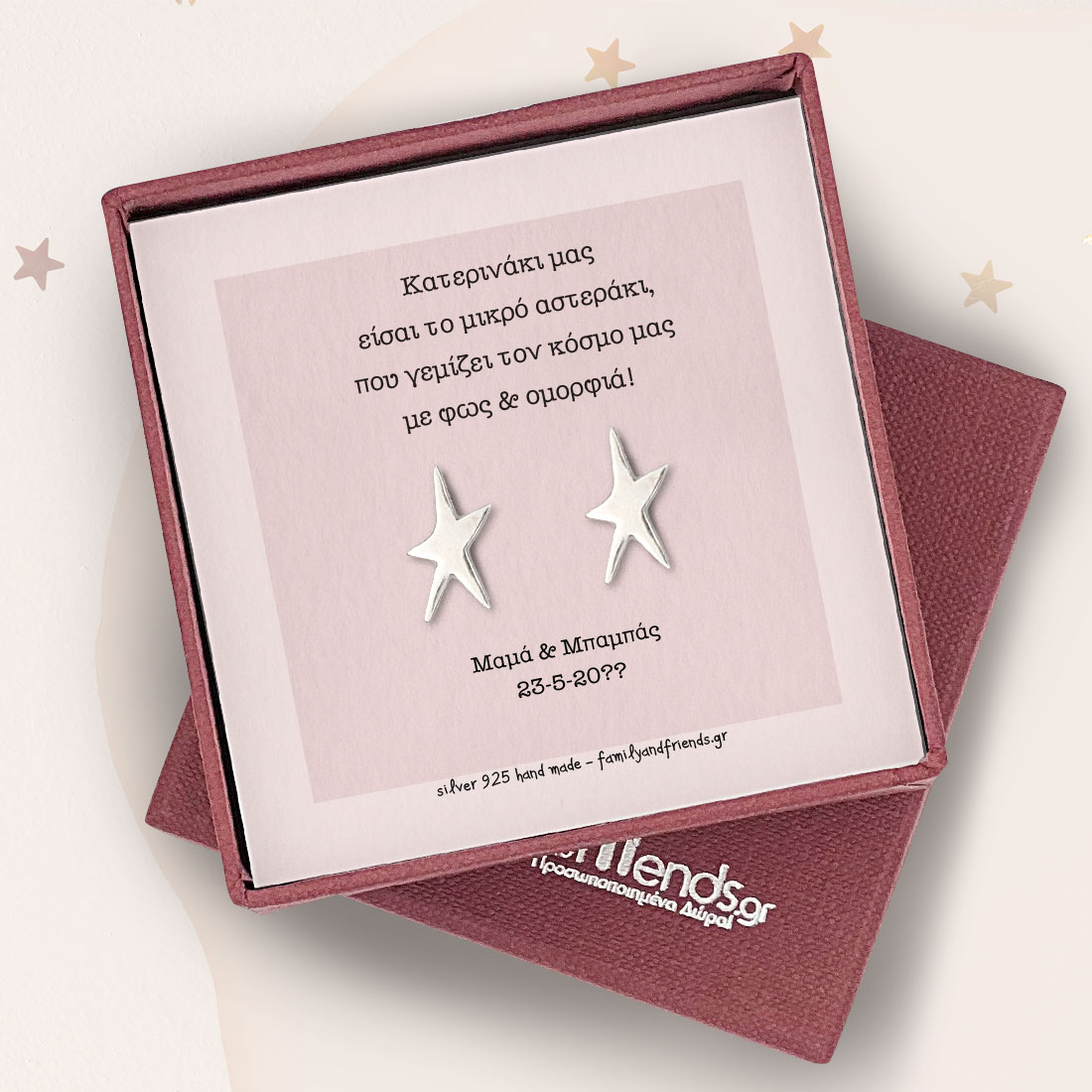 Μοναδικό Προσωποποιημένο Δώρο για κορίτσια φίλες με οποιαδήποτε αφορμή που θα δημιουργήσει μια μοναδική αξέχαστη στιγμή. Χειροποίητα ασημένια 925 σκουλαρίκια αστέρι, σε Κουτί με μήνυμα, δώρο για την αδελφή σας που γιορτάζει και θα τα φορά για πολλά χρόνια, δημιουργώντας μοναδΙκές αναμνήσεις. Δώρο ορκωμοσίας από την γιαγιά στην αγαπημένη της εγγονή, στην πιο ξεχωριστή μέρα της αποφοίτησης της, που ολοκληρώνει ένα στάδιο των σπουδών της!