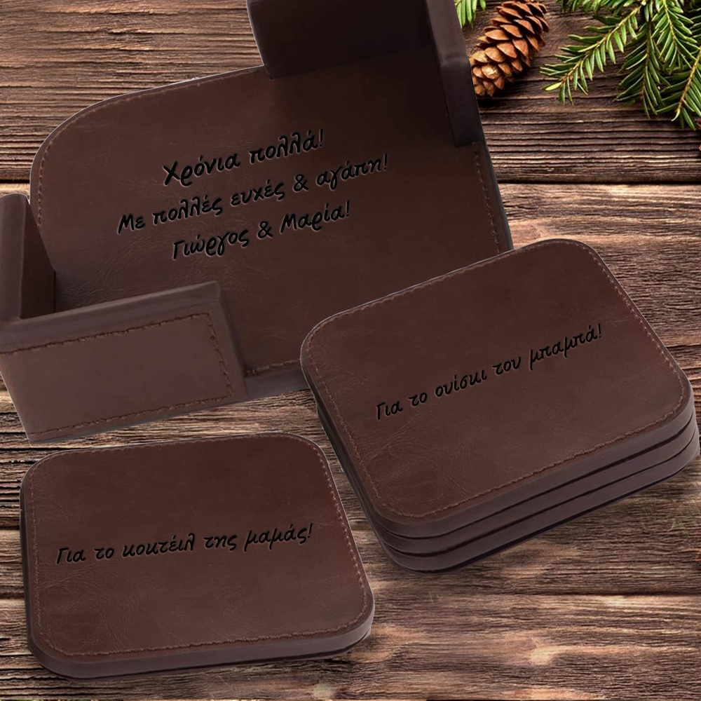 Προσωποποιημένο δώρο Με Ευχές, Ονόματα, σετ 4 Δερμάτινα Σουβέρ με βάση χαραγμένο με Laser, για το σπίτι της Μαμάς & του Μπαμπά, με αφορμή τα γενέθλια τους, που θα ξεχωρίσει από όλα τα άλλα δώρα αμέσως. Χαραγμένο με λέιζερ, Προσωποποιημένη Δερμάτινο Σετ 4 Σουβέρ, Μήνυμα στη βάση χαραγμένο με Laser, ένα διαφορετικό δώρο για το κουμπάρο σας με κάθε αφορμή.