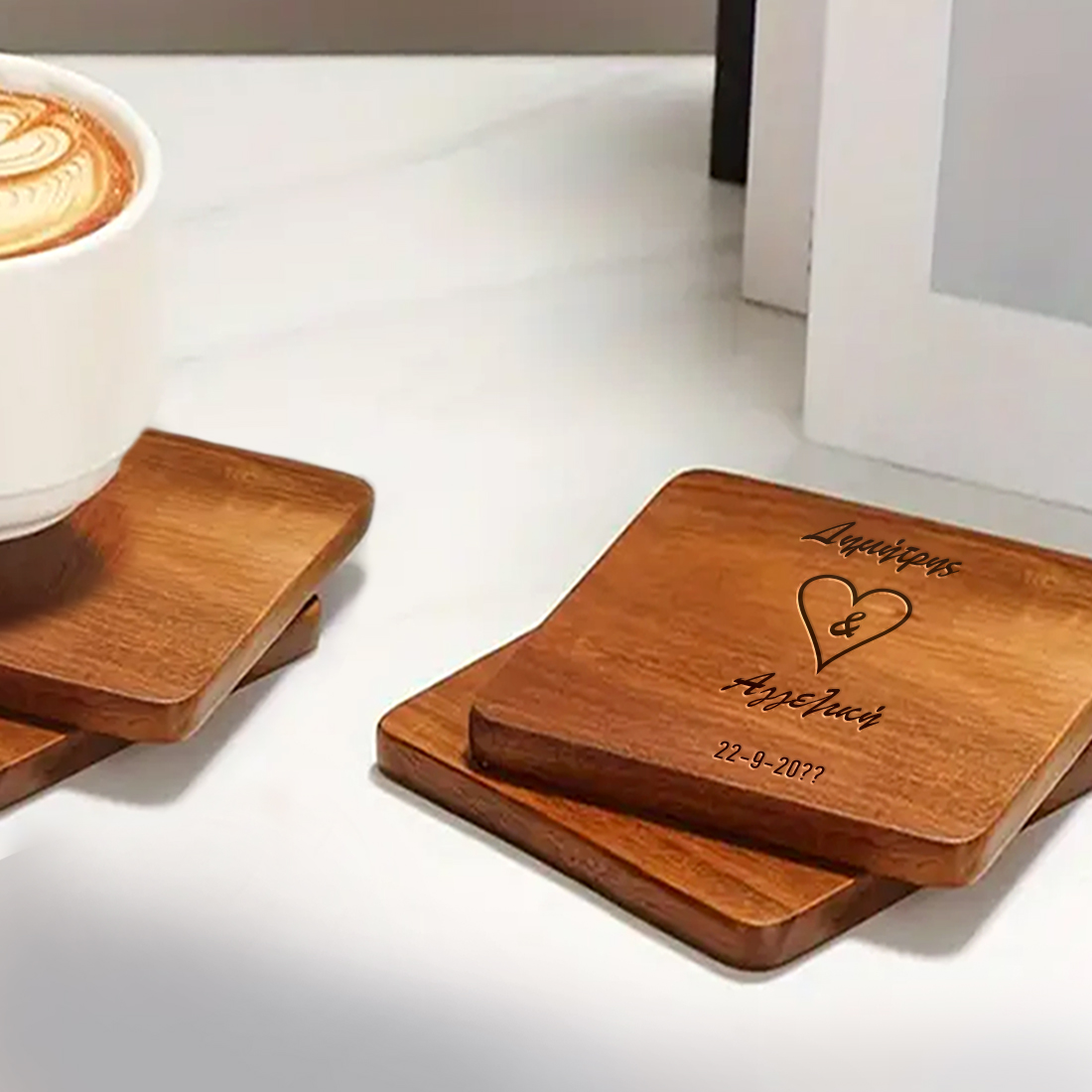 Προσωποποιημένο ξύλινο δώρο για γραφείο του άνδρα σας, Σουβέρ Ξύλινο με Χάραξη Καρδιά, Αρχικά, Ημ/νία, χαραγμένα με laser, για βάζει τον καφέ του κάθε μέρα. Κάντε ένα πρωτότυπο δώρο στο αγόρι σας για τα γενέθλια του για να απολαμβάνει το αγαπημένο του ποτό.