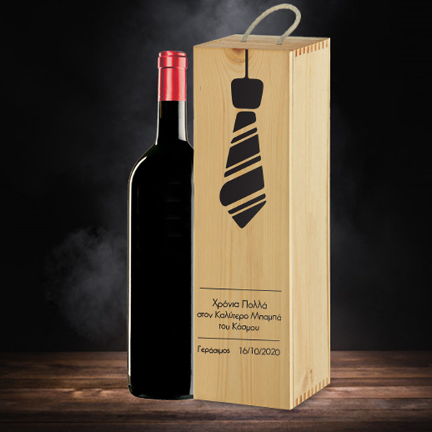 Ένα Μοναδικό Προσωποποιημένο Δώρο για Χρόνια Πολλά, Γραβάτα σε Ξύλινο Κουτί για Κρασί, με Μήνυμα, Ονόματα, για τον Μπαμπά, για να πείτε χρόνια πολλά στον αγαπημένο σας Μπαμπά για δώρο με αφορμή την Γιορτή του Πατέρα. Το Πρωτότυπο Δώρο γενεθλιων και ονομαστικής γιορτής, για Χρόνια Πολλά Προσωποποιημένο με Ευχές, Γραβάτα σε Ξύλινο Κουτί για Κρασί, με Μήνυμα, Ονόματα. Γραβάτα σε Ξύλινο Κουτί για Κρασί, με Μήνυμα, είναι ένα πρωτότυπο και οικονομικό δώρο που μπορείτε να κάνετε για δώρο γενεθλίων στον Παππού, δώρο ονομαστικής γιορτης στον Μπαμπά, δώρο γενεθλίων στον Νονο, δώρο ονομαστικής γιορτης στον θείο, θα είναι η έκπληξη που θα εντυπωσιάσει και θα δείξετε ότι τον θυμηθήκατε και πόσο πολύ τον αγαπάτε! Κάντε και εσείς ένα μοναδικό προσωποποιημένο Δώρο, Γραβάτα σε Ξύλινο Κουτί για Κρασί, με Μήνυμα, Ονόματα, στον ανδρα σας μαζί με τα παιδιά και θα στολίζει το γραφείο του για πάντα θυμίζοντας την στιγμή που του του προσφέρατε το δώρο για πάντα είτε είναι ονομαστική γιορτή είτε ένα δώρο με οποιοδήποτε αφορμή. Γραβάτα σε Ξύλινο Κουτί για Κρασί, με Ονόματα, είναι ένα ξεχωριστό δώρο για την ημέρα της γιορτής του Πατέρα που είναι κάθε χρόνο τον ιούνιο. Χρόνια Πολλά με Δώρο για νονο, παππου και κάθε φίλο, Ξύλινο Κουτί για Κρασί, Προσωποποιημένο με Ευχές, φτιάχνεται κάθε φορά αποκλειστικά μόνο για τον δικό σας Μπαμπά μένει για πάντα αναμνηστικό γιατί έχει τα ονοματα και την ημερομηνία που προσφέρατε το δώρο. Με ένα κλικ: ΔΕΙΤΕ ΤΑ ΚΡΑΣΙΑ ΠΟΥ ΧΡΗΣΙΜΟΠΟΙΟΥΜΕ ΠΕΡΙΓΡΑΦΗ ΕΠΙΛΟΓΩΝ Α. Ξύλινο Κουτί για 1 Κρασί με ειδική Προσωποποιημένη εκτύπωση Ξύλινο κουτί για ένα μπουκάλι κρασί Διάσταση 9,5cm X 34,5cm Χ 9,8cm Β. Με Κόκκινο Κρασί Ξύλινο Κουτί με ειδική Προσωποποιημένη εκτύπωση και ένα Κόκκινο Μπουκάλι Κρασί Γ. Με Λευκό Κρασί Ξύλινο Κουτί με ειδική Προσωποποιημένη εκτύπωση και ένα Λευκό Μπουκάλι Με ένα κλικ: ΔΕΙΤΕ ΤΑ ΚΡΑΣΙΑ ΠΟΥ ΧΡΗΣΙΜΟΠΟΙΟΥΜΕ