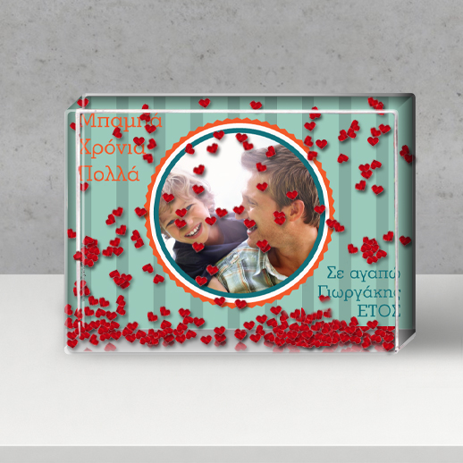 Πρωτότυπη Κορνίζα με αιωρούμενες καρδούλες με φωτογραφία Προσωποποιημένη, Μπαμπά σε αγαπώ, με ονόματα και ημερομηνία, ένα Μοναδικό Προσωποποιημένο Δώρο για την γιορτή του πατέρα, για να πείτε χρόνια πολλά στον αγαπημένο σας μπαμπα που γιορτάζει. Η Πρωτότυπη Κορνίζα με αιωρούμενες καρδούλες σε υγρό έχει την ίδια λογική με την κλασική χιονόμπαλα που ξέρετε αλλά αντί για χιόνι αιωρούνται καρδούλες μέσα στο υγρό όταν την κουνάτε. Το δώρο Κορνίζα με αιωρούμενες καρδούλες με φωτογραφία Προσωποποιημένη είναι το διαφορετικό δωρο με κάθε αφορμή στον μπαμπα, και τον παππου, που θα εντυπωσιάσει και θα δείξετε ότι την θυμηθήκατε και πόσο πολύ την αγαπάτε! Κάντε και εσείς ένα μοναδικό προσωποποιημένο Δώρο, Κορνίζα με αιωρούμενες καρδούλες με φωτογραφία στην μαμά ή τον Μπαμπα με αφορμή τα γενέθλια του ή δωρο ονομαστικής γορτής για τον μπαμπα, μαμα. Η Κορνίζα με αιωρούμενες καρδούλες και φωτογραφία, είναι ένα μοναδικό δώρο για να ευχηθείται χρόνια πολλά και στον ΘΕΙΟ ή δωρο γενεθλιων για την νονά με αφορμή τα γενέθλια ή την ονομαστικη γιορτή τους απλά αλλάζοντας τα κείμενα που σας προτείνουμε με όποια κειμενα θέλετε να γράψετε εσείς. Η Κορνίζα με αιωρούμενες καρδούλες με φωτογραφία Προσωποποιημένη, μπαμπα σε αγαπω πολύ, φτιάχνεται κάθε φορά αποκλειστικά μόνο για τον δικο σας, μπαμπα και μένει για πάντα αναμνηστικό γιατί έχει τα ονοματα και την ημερομηνία που προσφέρατε το δώρο. ΣΕ ΚΑΘΕ ΠΡΟΙΟΝ ΜΠΟΡΕΙΤΕ ΝΑ ΓΡΑΨΕΤΕ ΟΤΙ ΘΕΛΕΤΕ ΕΣΕΙΣ ΑΝΕΞΑΡΤΗΤΑ ΑΠΟ ΑΥΤΟ ΠΟΥ ΣΑΣ ΠΡΟΤΕΙΝΟΥΜΕ ΠΕΡΙΓΡΑΦΗ Πρωτότυπη Κορνίζα με αιωρούμενες καρδούλες σε υγρό σαν την κλασική χιονόμπαλα που ξέρετε αλλά αντί για χιόνι αιωρούνται καρδούλες μέσα στο υγρό Διαστάσεις 10cm Χ 15cm Χ 2cm Στέκεται με την μικρή ή την μεγάλη διάσταση 4χρωμη εκτύπωση για το εικαστικό