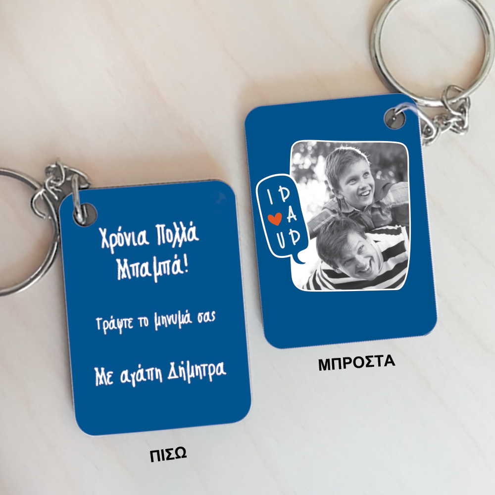 Μπρελόκ Δώρο με Φωτογραφία, Ονόματα, Μήνυμα, Προσωποποιημένο για Χρόνια Πολλά, ένα μοναδικό δώρο για την Γιορτή του Πατέρα, fathers day, που είναι κάθε Ιούνιο την 3η Κυριακή! Μπορείτε να γράψετε ότι εσείς θέλετε στο δώρο για να θυμάστε πάντα την στιγμή που ζήσατε με τον Μπαμπά.