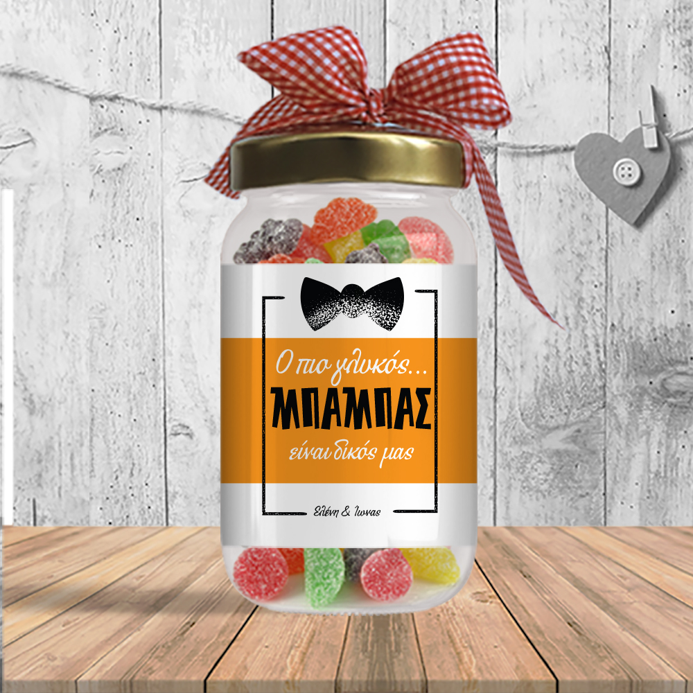 Προσωποποιημένο Δώρο για τον Μπαμπά που γιορτζει την ονομαστική του γιορτή, με Ονόματα, Ευχές Βαζάκι Καραμέλες ένα δώρο έξω από τα συνηθισμένα που μπορεί να τους προσφέρετε και θα μείνει αναμνηστικό για πάντα.