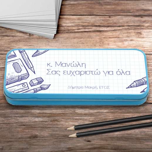 Μεταλλική Θήκη για στυλό Προσωποποιημένη, για Δάσκαλο με Όνομα, ένα μοναδικό αναμνηστικό δώρο για την Δασκάλα ή τον Δάσκαλο του παιδιού σας, Προσωποποιημένη με ημερομηνία με αφορμή το τέλος της σχολικής χρονιάς ή κάθε άλλη αφορμή. Στο familyandfriends.gr θα βρείτε μοναδικά προσωποποιημένα δώρα γενεθλίων και δώρα γιορτών προσωποποιημένα με ονοματα, ευχές, ημερομηνία, ηλικία και ότι άλλο θέλετε εσείς να γράψετε για αγόρια και κορίτσια, ανδρες και γυναίκες Η Δασκαλα σας όπως είναι φυσικό δουλεύει χρησιμοποιώντας αρκετά στυλο και μολύβια κάθε μέρα έτσι το Προσωποποιημένο δώρο, Μεταλλική Θήκη για στυλό Προσωποποιημένη, για Δάσκαλο με Όνομα, ημερομηνία, είναι το δώρο που θα την ενθουσιάσει, θα το χρησιμοποιεί κάθε μέρα και θα δουλεύει πιο ξεκούραστα με το κομπιούτερ. Το δώρο Μεταλλική Θήκη για στυλό Προσωποποιημένη, για Δάσκαλο με Όνομα, μπορεί να είναι το δώρο με αφορμή τα γενέθλια ή την γιορτή της δασκάλας ή του δάσκαλου και θα ξεχωρίσει από όλα τα άλλα δώρα αμέσως, γιατί είναι προσωπικό και φτιάχνεται αποκλειστικά για την δική σας δασκάλα ή δασκαλο. Είναι επίσης ένα πρωτότυπο αναμνηστικό δωράκι για κάθε καθηγητή σας εργάζεται κάθε μέρα αρκετές ώρες στο γραφείο με το κομπιούτερ. Στα Προσωποποιημένα δώρα με Φωτογραφία, Προσωποποιημένη Μεταλλική Θήκη για στυλό, για το γραφειο της δασκάλας ή του δασκάλου μπορείτε να αλλάξετε τα κείμενα όπως εσείς θέλετε ανεξάρτητα από την δική μας πρόταση. ΠΕΡΙΓΡΑΦΗ Μεταλλική Κασετίνα σε ροζ ή σιελ χρώμα Διαστάσεις: 190mm x 80mm x 25mm 4χρωμη εκτύπωση με προσωποποιημένο εικαστικό