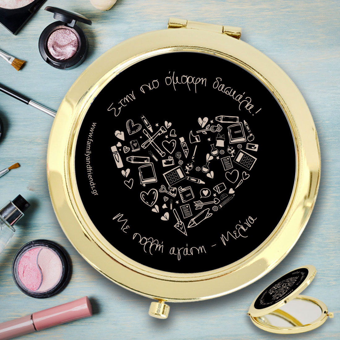 Στο familyandfriends.gr θα βρείτε μοναδικά προσωποποιημένα δώρα γενεθλίων και δώρα γιορτών προσωποποιημένα για ανδρες και γυναίκες. Η Δασκάλα, η Καθηγήτρια είναι ένα ξεχωριστό πρόσωπο στην καθημερινότητα και την ζωή του καθε παιδιού που πηγαίνει σε οποιαδήποτε βαθμίδα της σχολικής εκπαίδευσης. Το Προσωποποιημένο δώρο, Καθρεφτάκι Τσάνταs για δασκάλες, με Ονόματα, για Δασκάλες, Καθηγήτριες με Μήνυμα, Ονόματα για Δάσκαλους, Καθηγητές Μαθηματικών, για Δασκάλα, Δάσκαλο, για Δάσκαλες, δασκαλους, είναι το δώρο που θα την ενθουσιάσει, και θα το κρατήσει σαν αναμνηστικό της σχολικής χρονιάς για πάντα.