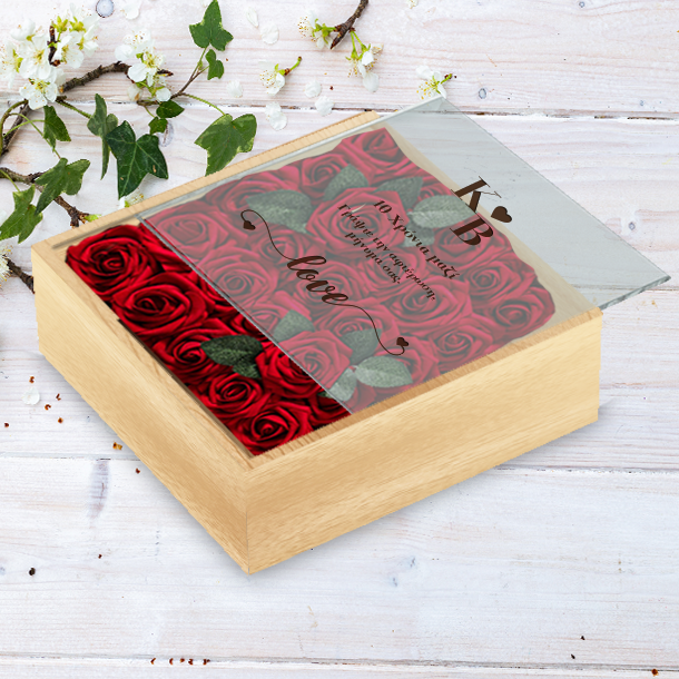 Διακοσμητικό Για επέτειο Κουτί με τεχνητά τριαντάφυλλα, καπάκι plexiglass με μήνυμα, προσωποποιημένο δώρο για ζευγάρια που γιορτάζουν με οποιαδήποτε αφορμή στη σχέση τους. Ένα διαφορετικό & Προσωποποιημένο Δώρο, για να πείτε χρόνια πολλά στην αγαπημένη σας με αφορμή τα γενέθλια της.