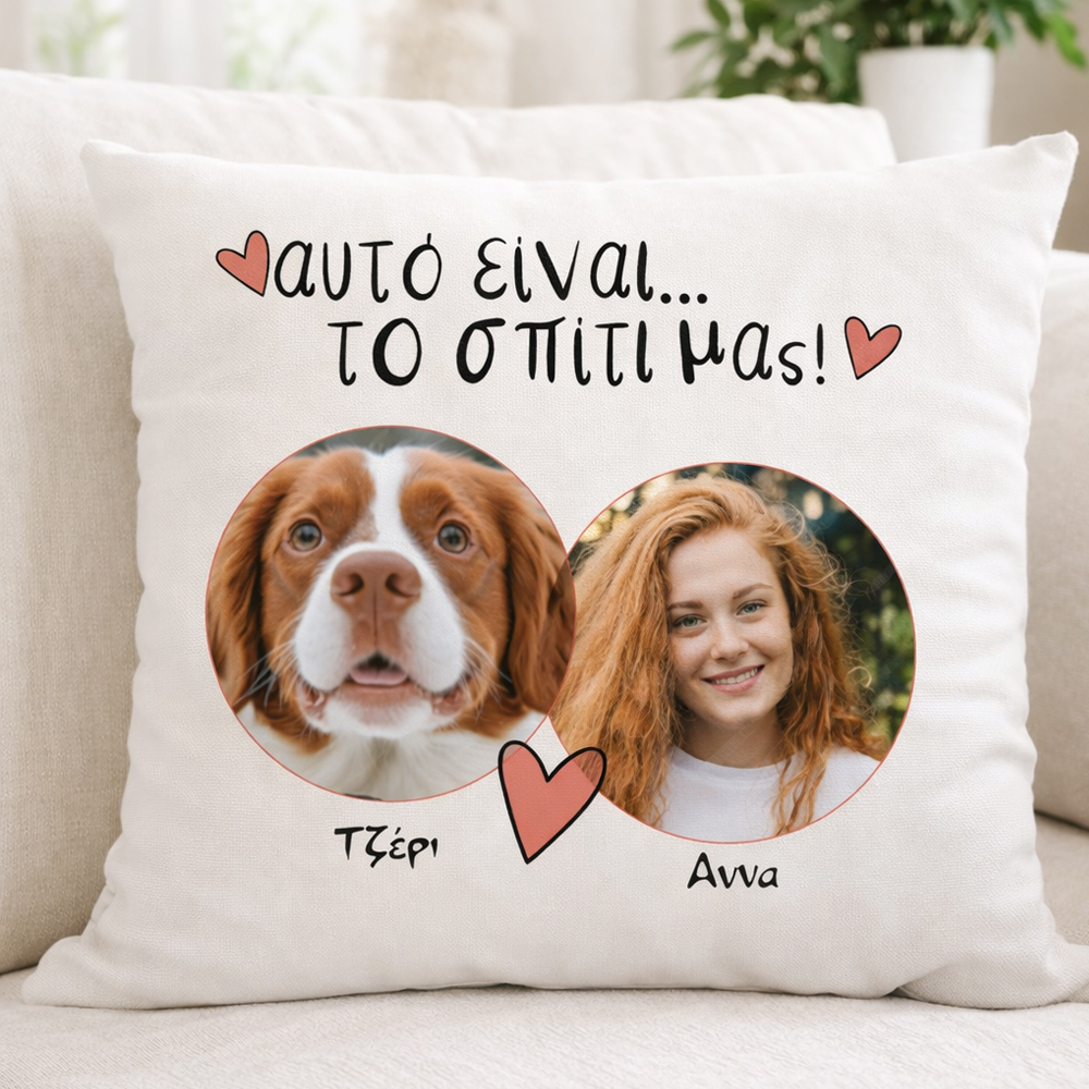 Το προσωποποιημένο μαξιλάρι με φωτογραφίες κατοικίδιου και ιδιοκτήτη, μαζί με τα ονόματα τους είναι ένα μοναδικό διακοσμητικό για τον καναπέ στο καθηστικο σας.