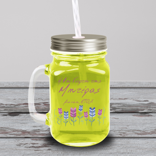 Βαζάκι – Ποτήρι διάφανο με Χερούλι, Καλαμάκι 4 χρωμη ειδική εκτύπωση