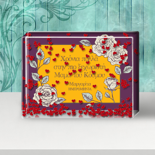 Πρωτότυπη Προσωποποιημένη Κορνίζα με αιωρούμενες καρδούλες, στην πιο ξεχωριστή Μαμά, με ονόματα και ημερομηνία, ένα Μοναδικό Προσωποποιημένο Δώρο για την γιορτή της Μητέρας, για να πείτε χρόνια πολλά στην αγαπημένη σας μαμά που γιορτάζει. Η Πρωτότυπη Κορνίζα με αιωρούμενες καρδούλες σε νερό έχει την ίδια λογική με την κλασική χιονόμπαλα που ξέρετε αλλά αντί για χιόνι αιωρούνται καρδούλες μέσα στο νερό όταν την κουνάτε. Το Δώρο Προσωποποιημένη Κορνίζα με αιωρούμενες καρδούλες, στην πιο ξεχωριστή Μαμά, για την γιορτή της μητέρας με ονόματα και ημερομηνία, είναι ένα πρωτότυπο και οικονομικό δώρο που μπορείτε να κάνετε με κάθε αφορμή στην Μαμά, και την γιαγιά, που θα εντυπωσιάσει και θα δείξετε ότι την θυμηθήκατε και πόσο πολύ την αγαπάτε! Κάντε και εσείς ένα μοναδικό προσωποποιημένο Δώρο, Κορνίζα με αιωρούμενες καρδούλες και φωτογραφία στην μαμά ή τον Μπαμπα με αφορμή τα γνέθλια του ή την ονομαστική γορτή τους που γιορτάζετε. Η Κορνίζα για την Μαμά με αιωρούμενες καρδούλες και φωτογραφία, είναι ένα μοναδικό δώρο για να ευχηθείται χρόνια πολλά και στον ΘΕΙΟ ή την νονά με αφορμή τα γενέθλια την γιορτή τους απλά αλλάζοντας τα κείμενα που σας προτείνουμε με όποια κέιμενα θέλετε να γράψετε εσείς. Η Προσωποποιημένη Κορνίζα με αιωρούμενες καρδούλες, στην πιο ξεχωριστή Μαμά, φτιάχνεται κάθε φορά αποκλειστικά μόνο για τον δικη σας, μαμα και μένει για πάντα αναμνηστικό γιατί έχει τα ονοματα και την ημερομηνία που προσφέρατε το δώρο. ΣΕ ΚΑΘΕ ΠΡΟΙΟΝ ΜΠΟΡΕΙΤΕ ΝΑ ΓΡΑΨΕΤΕ ΟΤΙ ΘΕΛΕΤΕ ΕΣΕΙΣ ΑΝΕΞΑΡΤΗΤΑ ΑΠΟ ΑΥΤΟ ΠΟΥ ΣΑΣ ΠΡΟΤΕΙΝΟΥΜΕ ΠΕΡΙΓΡΑΦΗ Πρωτότυπη Κορνίζα με αιωρούμενες καρδούλες σε νερό σαν την κλασική χιονόμπαλα που ξέρετε αλλά αντί για χιόνι αιωρούνται καρδούλες μέσα στο νερό Διαστάσεις 10cm Χ 15cm Χ 2cm Στέκεται με την μικρή ή την μεγάλη διάσταση 4χρωμη εκτύπωση για το εικαστικό