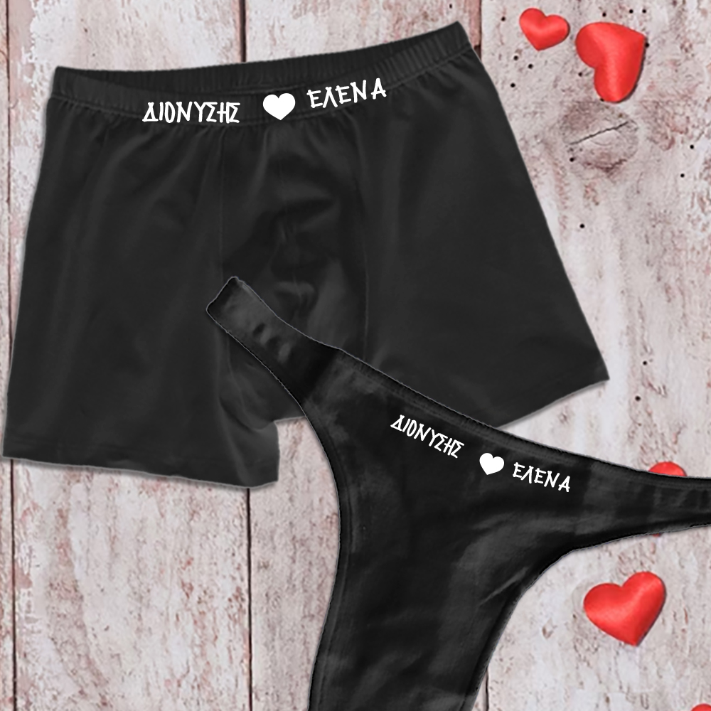 Με Όνομα ή ημερομηνία κιλοτάκι προσωποποιημένο Δώρο στην Γυναίκα σας με αφορμή την valentines day που είναι σε λίγες ημέρες. Γράψτε το κείμενο σας ή τα ονόματα που θέλετε και το προσωποποιημένο δώρο Σετ Ανδρικό & Γυναικείο Εσώρουχο με τα ονόματα σας ή την αγαπημένη σας ημερομηνία θα δημιουργήσει μια αξέχαστη στιγμή στη σχέση σας,