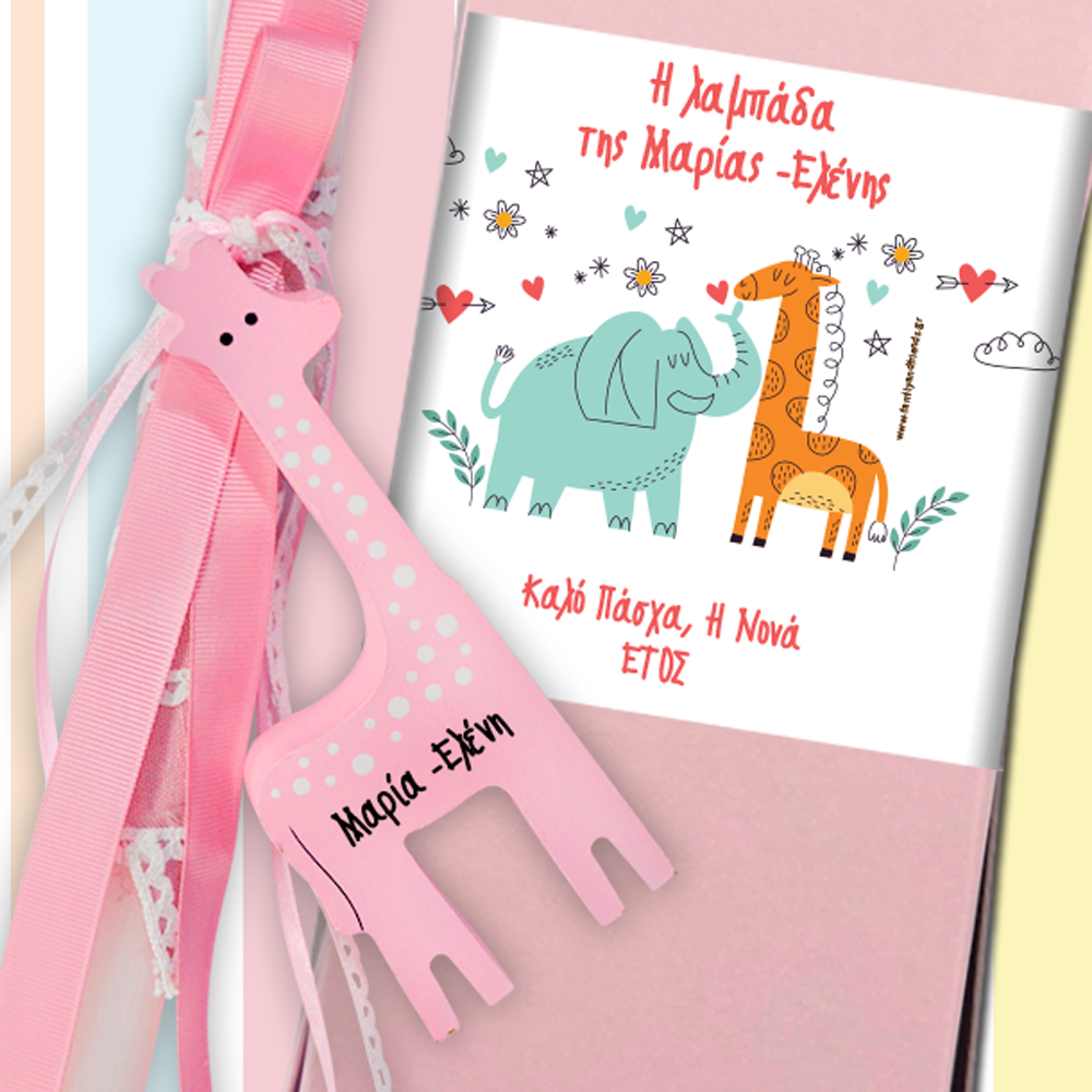 Είστε Νονός ή Νονά και ψάχνεται λαμπάδα για το Βαφτιστήρι σας; Χειροποίητη Λαμπάδα με κουτί, Ξύλινη Καληπάρδαλη με Όνομα, Ευχές, αυτό το πάσχα η Λαμπάδα της νονάς μπορεί να είναι ξεχωριστή και προσωποποιημένη. Επιλέξτε μια από τις Προσωποποιημένες χειροποίητες πασχαλινές Λαμπάδες με ή χωρίς το αντίστοιχο κουτί που θα είναι ξεχωριστή από όλες τις λαμπάδες που προσφέρατε μέχρι σήμερα. Χειροποίητη Πασχαλινή Λαμπάδα με διακόσμηση από ύφασμα και δαντέλα με σατέν κορδέλες και Προσωποποιημένο ξύλινο διακοσμητικό Καμηλοπάρδαλη με ειδική εκτύπωση με όνομα. Αυτό το Πάσχα μπορείτε να κάνετε στο βαφτιστήρι σας, Αγόρι ή Κορίτσι, για την Ανάσταση, δώρο μια πρωτότυπη και ξεχωριστή προσωποποιημένη Πασχαλινή Χειροποίητη Λαμπάδα με Όνομα, Ευχές. H Χειροποίητη Λαμπάδα με ξύλινο διακοσμητικό Καμηλοπάρδαλη με Ευχές Προσωποποιημένη, η οποία έχει ξύλινο διακοσμητικό Καμηλοπάρδαλη με το όνομα του παιδιού, μαζί με το Προσωποποιημένο κουτί με τις ευχές σας, το έτος και το όνομα κοριτσιού.