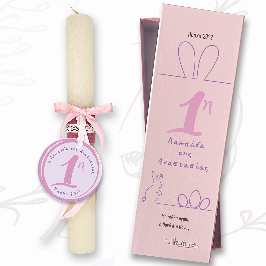 Στο familyandfriends.gr θα βρείτε μοναδικά προσωποποιημένα Πασχαλινά δώρα, γενεθλίων και δώρα γιορτών προσωποποιημένα για αγόρια και κορίτσια, άνδρες και γυναίκες. Η πρώτη μου Λαμπάδα με Όνομα, για κορίτσι Χειροποίητη σε κουτί, είναι η εκπληξη που θα κάνει η νονά στο βαπτιστήρι της, που θα παει πρωτη φορά στην ανασταση με την λαμπάδα του & θα κρατηθεί για πάντα.
