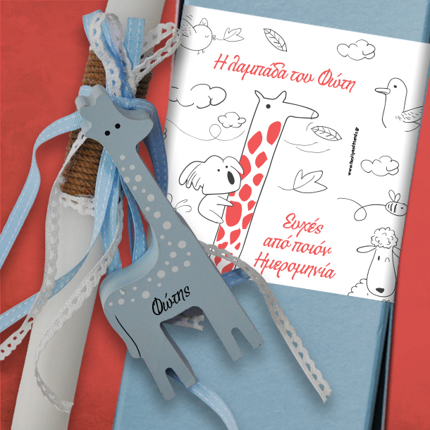 H Χειροποίητη Λαμπάδα με ξύλινο διακοσμητικό Καμηλοπάρδαλη με Ευχές Προσωποποιημένη, η οποία έχει ξύλινο διακοσμητικό Καμηλοπάρδαλη με το όνομα του παιδιού, μαζί με το Προσωποποιημένο κουτί με τις ευχές σας, το έτος και το όνομα αγοριού.